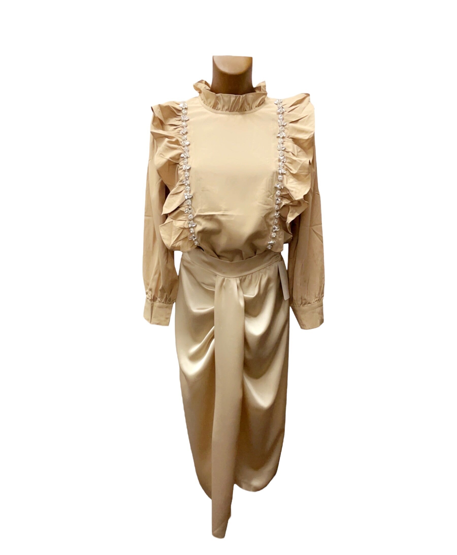 Blouse met hoge roesjes kraag en roesjes op de mouwen. Bewerkt met steentjes.