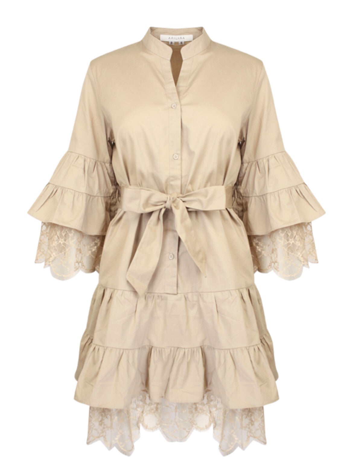 De jurk heeft gesmokte trompet mouwen met details van kant. Het rok gedeelte van de jurk is gesmokt, heeft aan de onderzijde details van kant en bevat een onderrok. De jurk heeft een strik ceintuur.