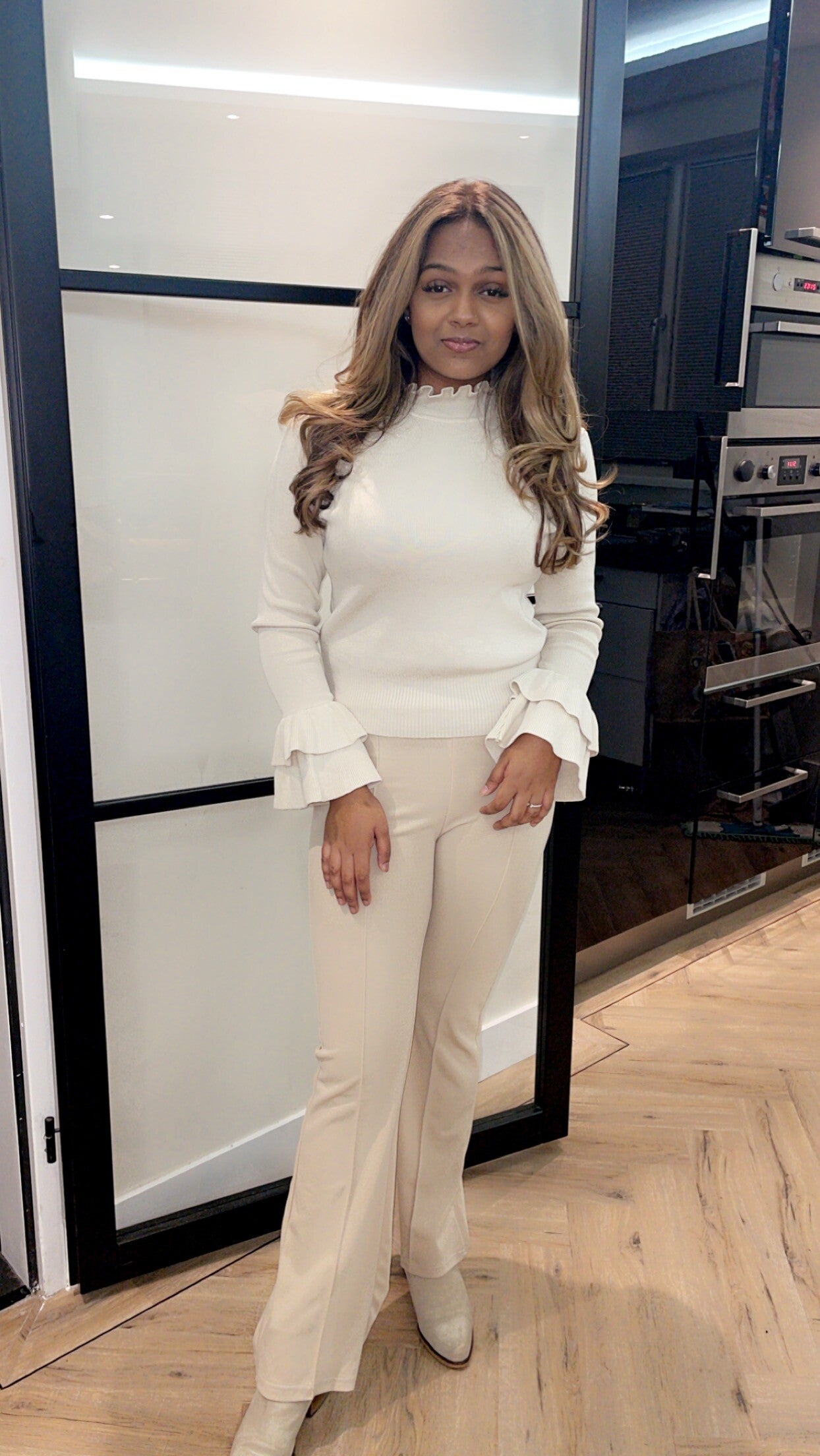BASIC//Prachtige top met hoog kraagje en ruffles op de mouwen.
